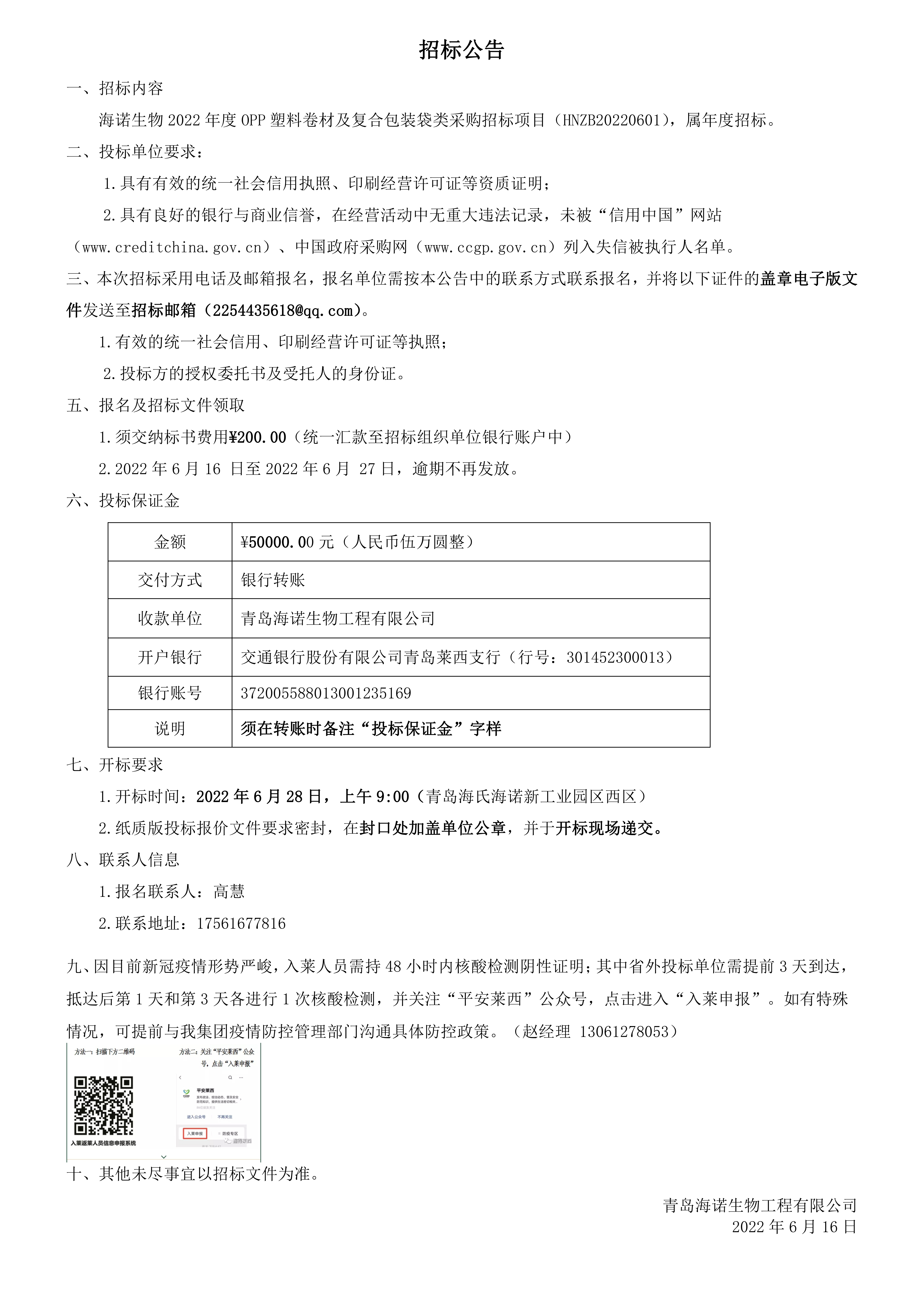 2022.06.22海諾生物2022年度OPP塑料卷材及復(fù)合包裝袋類采購招標(biāo)正式開始,屆時我們將秉承公正、公平、公開、透明的招標(biāo)原則,期待優(yōu)秀供應(yīng)商的廣泛參與。具體招標(biāo)細(xì)節(jié)如下: