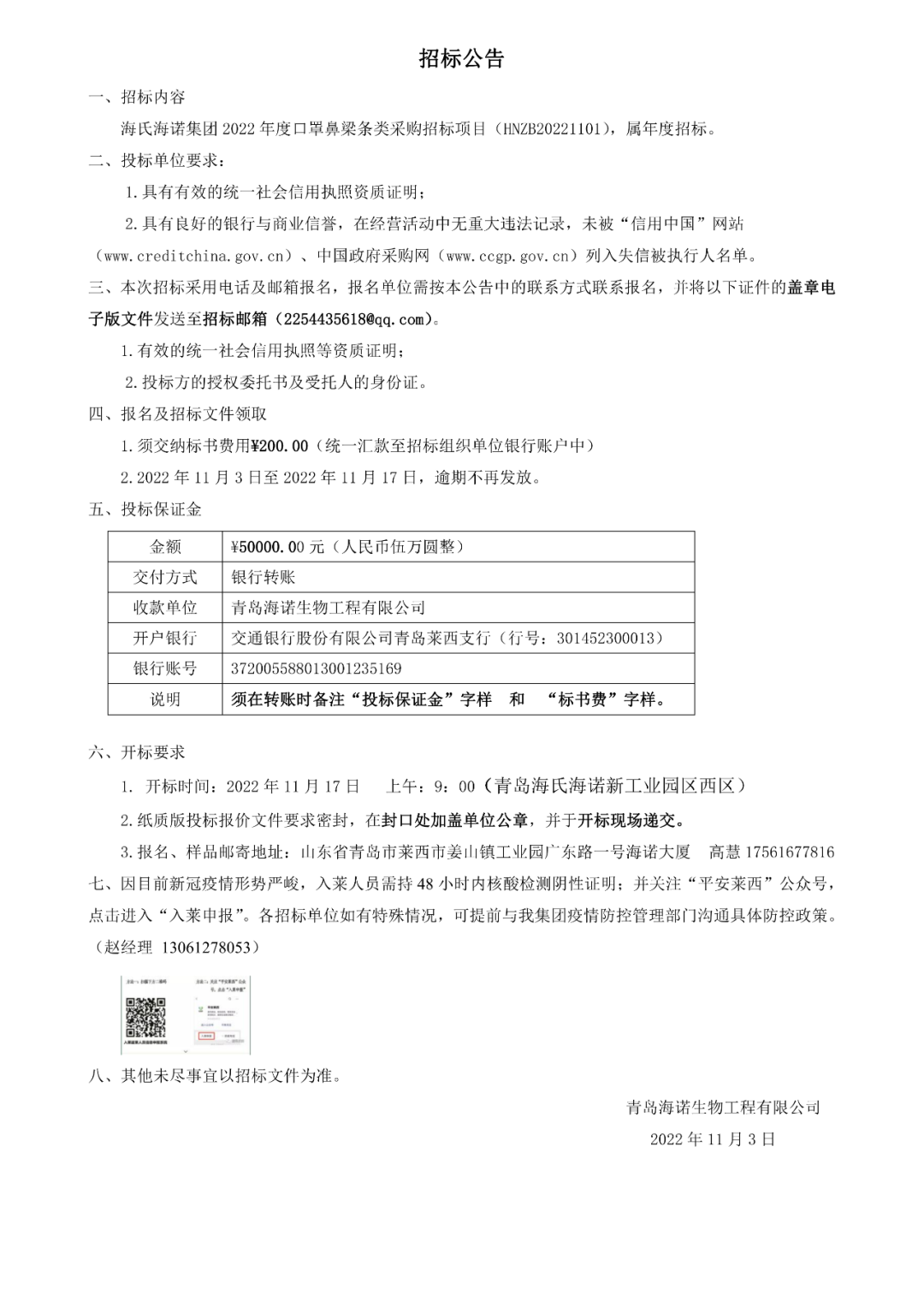 2022.11.04海氏海諾集團(tuán) 2022 年度口罩鼻梁條類采購招標(biāo)項(xiàng)目正式開啟,屆時我們將秉承公正、公平、公開、透明的招標(biāo)原則,期待優(yōu)秀供應(yīng)商的廣泛參與。具體招標(biāo)細(xì)節(jié)如下: