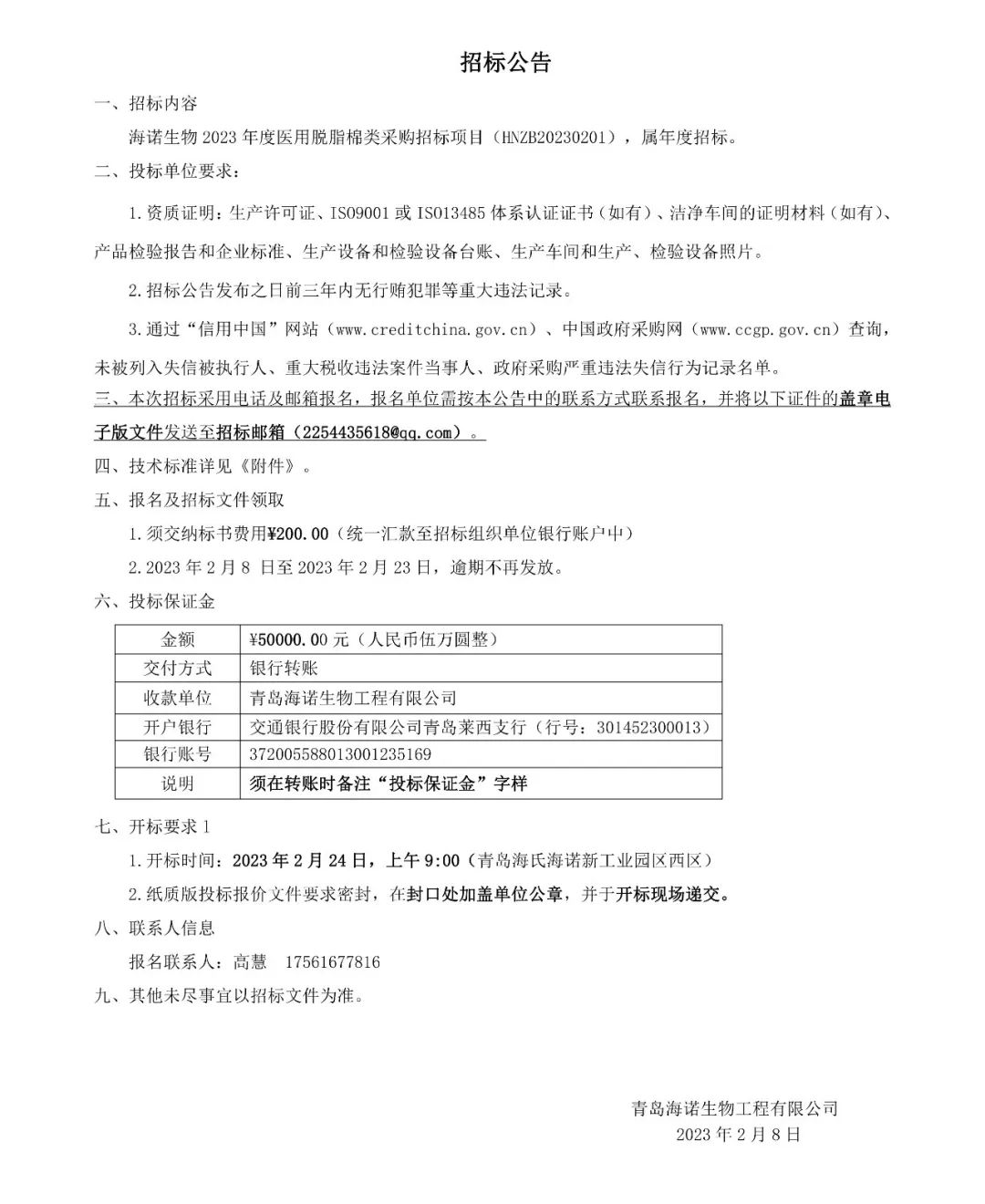 海諾生物 2023 年度醫(yī)用脫脂棉類采購(gòu)招標(biāo)項(xiàng)目正式開啟