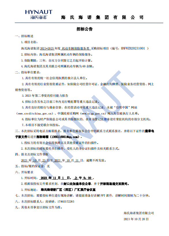 《海氏海諾集團2023-2025年度機動車輛保險服務類采購招標公告》