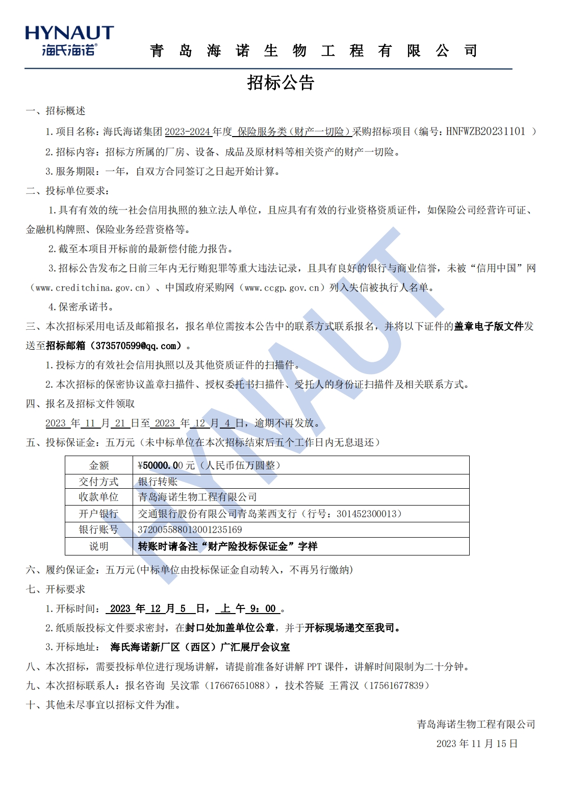 海氏海諾集團(tuán) 2023-2024 年度 保險(xiǎn)服務(wù)類(財(cái)產(chǎn)一切險(xiǎn))采購招標(biāo)項(xiàng)目(編號(hào):HNFWZB20231101 )