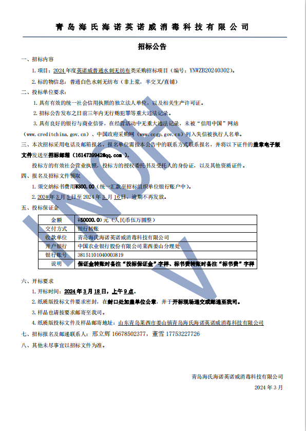 (2024)年度英諾威公司(無紡布)類采購(gòu)招標(biāo)公告