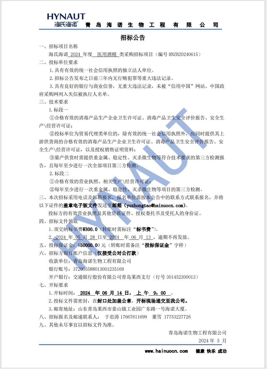海氏海諾2024年度醫(yī)用酒精類(lèi)采購(gòu)招標(biāo)項(xiàng)目(編號(hào) HNZB20240615)